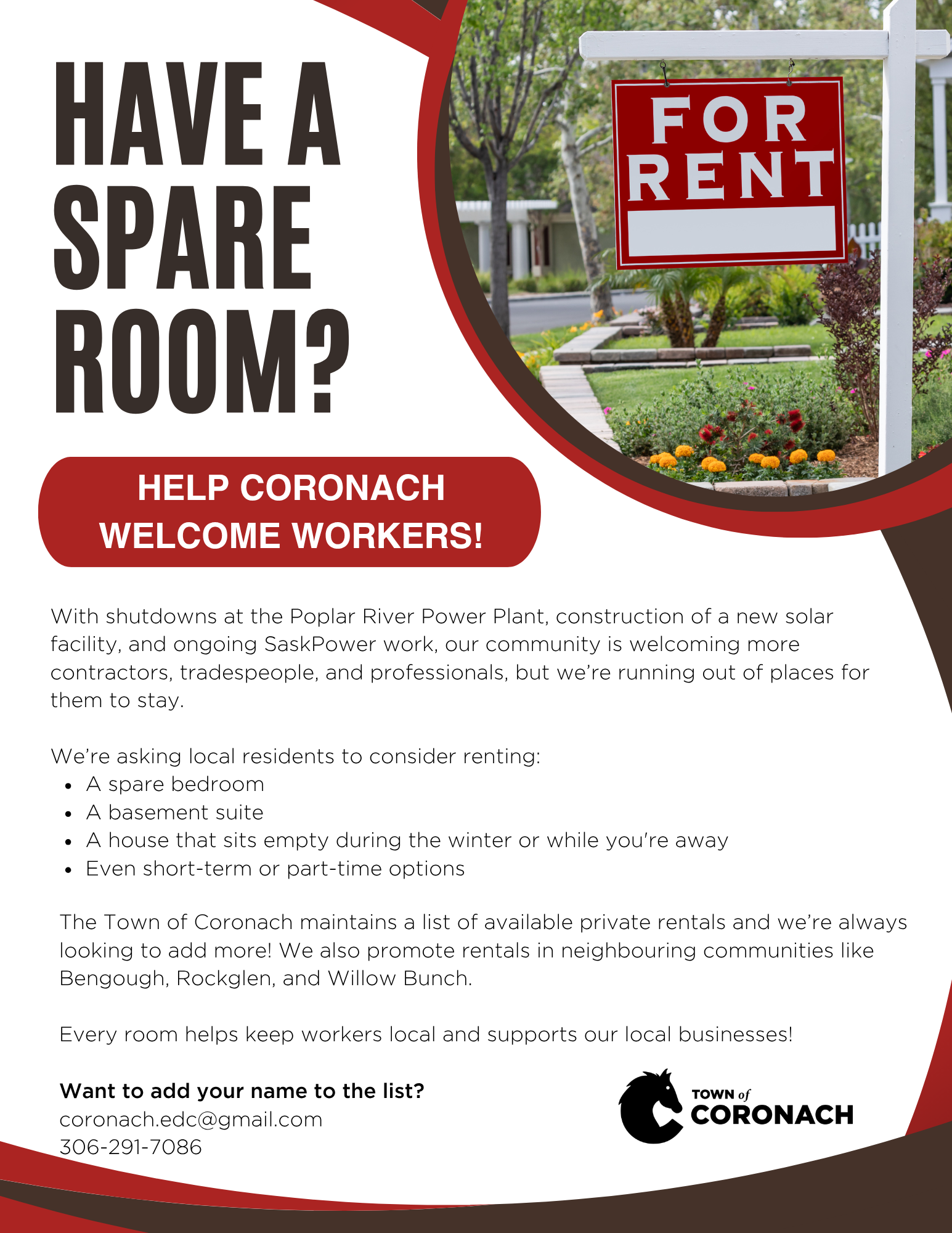 The Town of Coronach keeps a list of rentals. Contact us to add your space!